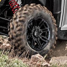 Llantas de 14" de aluminio en color negro mate junto a unos neumáticos de 27" de 8 lonas ofrecen un rendimiento, durabilidad e imagen excelente.