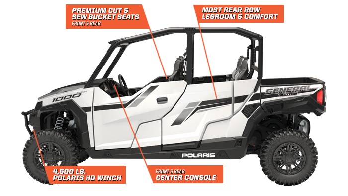 Las versiones Premium del Polaris GENERAL 4 incorporan además el techo Poly Sport, cabestrante Polaris HD de 4500 lb y defensa delantera que te ayudará a dominar...